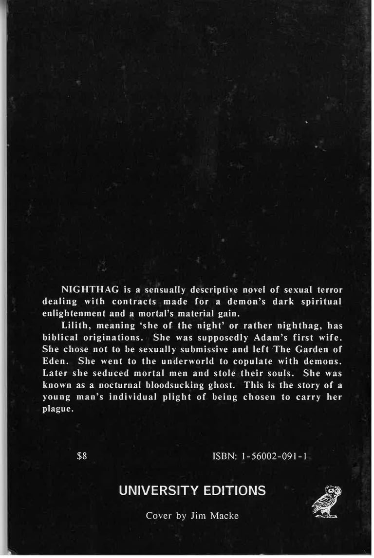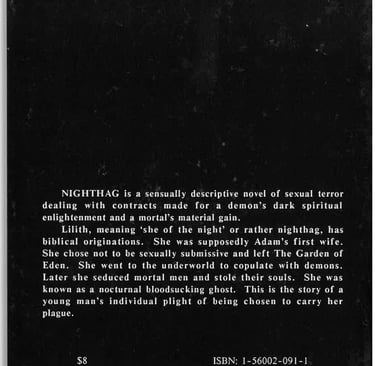 Nighthag was written in the early 1980's while doing copious amounts of cocaine and smoking lots of pot. I shopped it to commercial publishers, and I received a few rejections. During this time, my live-in girlfriend left me for a coke dealer, so my life went on hold, and further pursuits to publish this book were abandoned. As a young man, losing his first love, I thought my life was over. My muse was gone.